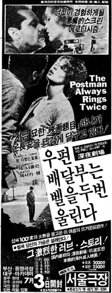 둘은 사랑에 빠진다, 그 사랑의 결과는 코라의 남편 그리스 인을 살해하는 것으로 마무리 된다.